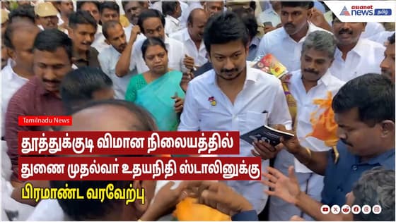 கன்னியாகுமரியில் நடைபெறும் திமுக தலைவரின் திருமணத்தில் கலந்து கொள்வதற்காக விமானம் மூலம் தூத்துக்குடி விமான நிலையம் வந்தடைந்த துணை முதல்வர் உதயநிதி ஸ்டாலினுக்கு மாவட்ட திமுக சார்பில் பிரமாண்ட வரவேற்பு அளிக்கப்பட்டது