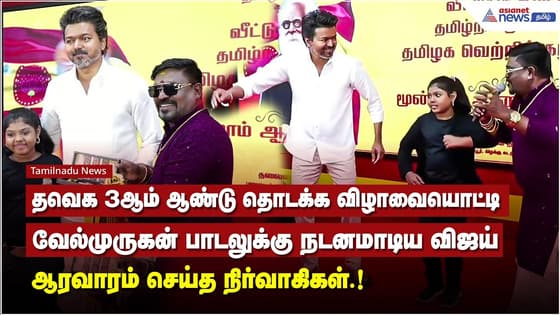 நடைபெற்ற விழாவில், பாடகர் வேல்முருகன் ஒரு ஸ்பெஷல் பாடல் ஒன்றை பாடினார். அந்தப் பாடலை கேட்டு வைப் ஆன விஜய், சட்டென மேடையில் ஆட்டம் போடத் தொடங்கினார். அந்த வீடியோ தற்போது சமூக வலைதளங்களில் செம வைரலாகி வருகிறது. அதைப்பார்த்த தவெக நிர்வாகிகள் விசிலடித்து அவரை உற்சாகப்படுத்தினர்.