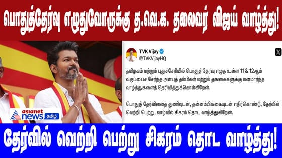 "தமிழகம் மற்றும் புதுச்சேரியில் பொதுத் தேர்வு எழுத உள்ள 11 & 12ஆம் வகுப்பைச் சேர்ந்த அன்புத் தம்பிகள் மற்றும் தங்கைகளுக்கு மனமார்ந்த வாழ்த்துகளைத் தெரிவித்துக்கொள்கிறேன். பொதுத் தேர்வினைத் துணிவுடன், தன்னம்பிக்கையுடன் எதிர்கொண்டு, தேர்வில் வெற்றி பெற்று, வாழ்வில் சிகரம் தொட வாழ்த்துகிறேன்," என விஜய் குறிப்பிட்டுள்ளார்.