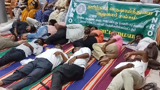 கரூர் மாவட்ட ஆட்சியர் அலுவலகம்.. படுத்துக் கொண்டே போராடும் வருவாய்த்துறை அலுவலர்கள்.. ஏன்? - முழு விவரம்!
