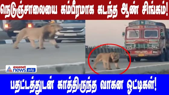 நெடுஞ்சாலையை கம்பீரமாக கடந்த ஆண் சிங்கம்!பதட்டத்துடன் காத்திருந்த வாகன ஓட்டிகள்!