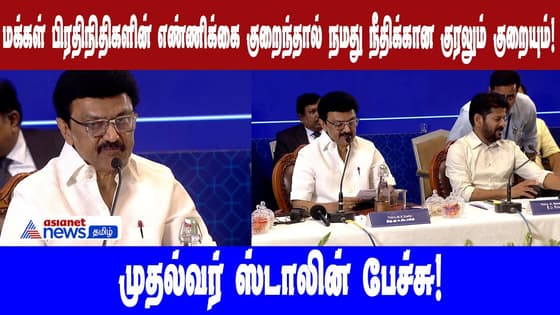 தொகுதி மறுசீரமைப்புக்கு எதிரான கூட்டு நடவடிக்கை குழு கூட்டம் சென்னை சோழா ஹோட்டலில் நடைபெற்று வருகிறது. அதில் பேசிய முதல்வர் ஸ்டாலின் மக்கள் பிரதிநிதிகளின் எண்ணிக்கை குறைந்தால் தமது நீதிக்கான குரலும் குறையும் ஆகையால் நாம் அனைவரும்தொகுதி மறுசீரமைப்புக்கு எதிராக ஒன்றிணைய வேண்டும் என பேசினார்.