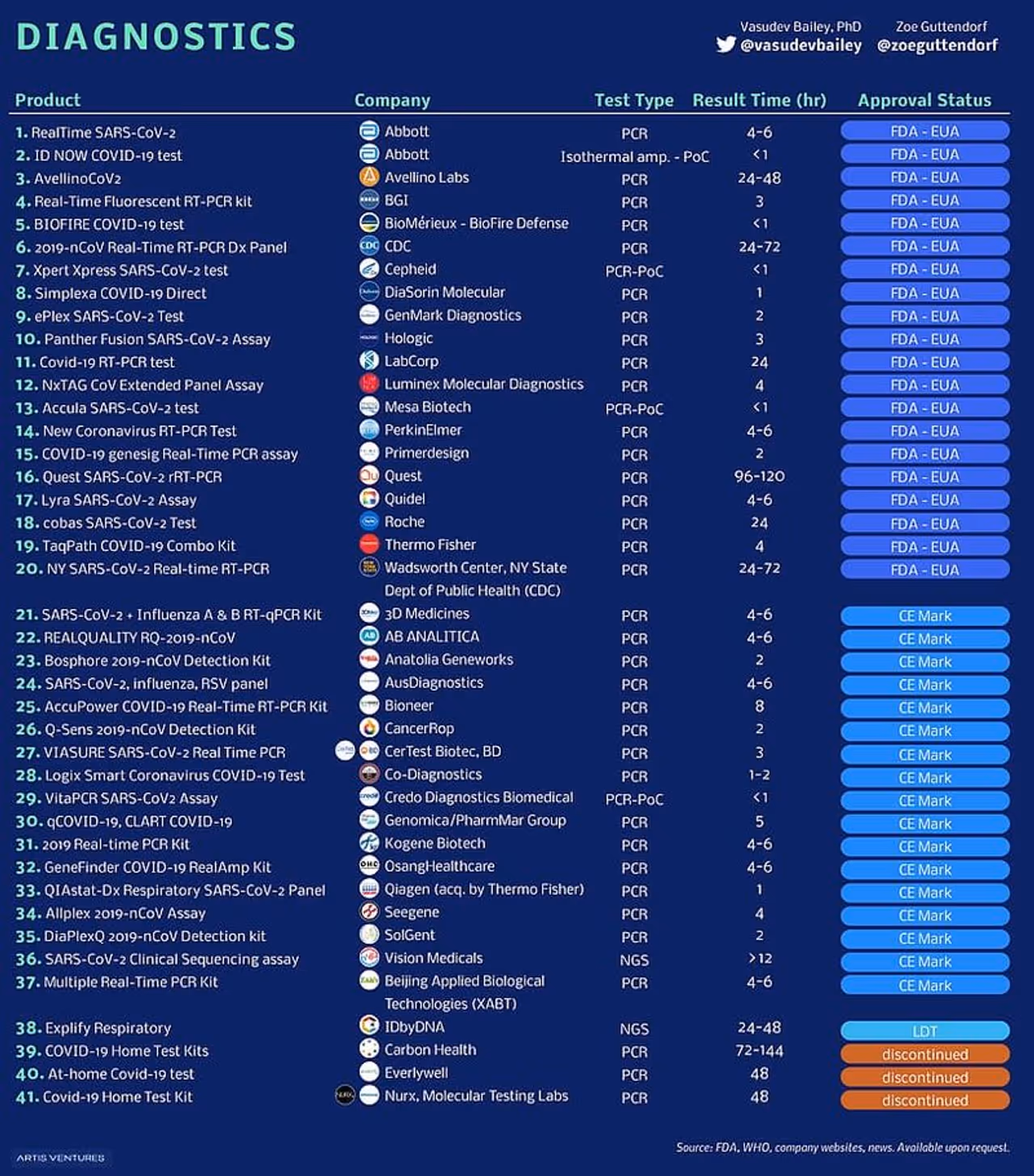 உலகம் முழுவதும் கரோனா வைரஸ் வேகமாக பரவி வருகிறது அதில் ஏராளமான மனித உயிரிழப்புகள் நிகழ்ந்து வருகிறது . இந்த வைரஸில் இருந்து மீளமுடியாமல் ஒட்டு மொத்த உலகமே திணறி வரும் நிலையில் விரைவில் தடுப்பு தடுப்பூசி கண்டுபிடிப்பது மட்டுமே இந்த வைரசில் இருந்து தப்பிக்க ஒரே வழி என்ற நோக்கில் உலகில் உள்ள ஒட்டுமொத்த ஆராய்ச்சியாளர்களும் தடுப்பூசி கண்டு பிடிப்பதில் தீவிரம் காட்டி வருகின்றனர் . இந்நிலையில் இதுவரை ஒருவருக்கு கொரோனா நோய்கள் ஏற்பட்டு இருக்கிறதா என்பதை முதலில் கண்டறிவதன் மூலம் அந்நோயை சமூகத்திலிருந்து வெகுவாக குறைக்க முடியும் என்ற அடிப்படையில் பல்வேறு நிறுவனங்கள் நோய்களை துல்லியமாகக் கணிக்கக் கூடிய சோதனை முறைகளை ஆராய்ந்து வருகின்றனர் , அந்த வகையில் கொரோனா தொற்று ஏற்பட்டிருக்கிறதா இல்லையா என்பதை கண்டறிவதற்கு 41 வகையான சோதனைகளை விஞ்ஞானிகள் கண்டறிந்துள்ளனர் அந்த சோதனை விவரங்கள் கீழே கொடுக்கப்பட்டுள்ளது.