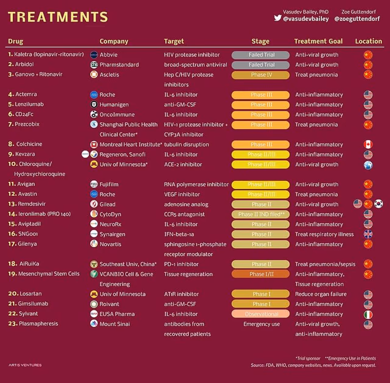 உலக சுகாதார நிறுவனம் தெரிவித்துள்ளது அதற்கு அடுத்த படியாக நோய்வாய்ப்பட்டவர்களுக்கு அளிக்க வேண்டிய சிகிச்சை முறைகள் குறித்தும் ஆராயப்பட்டு வருகிறது , ஏற்கனவே சார்ஸ், மெர்ஸ் போன்ற வைரஸ்களை தடுக்க நடத்தப்பட்ட சிகிச்சை முறைகளும் தற்போது மிகுந்த பயனுள்ளதாக இருப்பதாக ஆராய்ச்சியாளர்கள் தெரிவித்துள்ளனர் . அந்தவகையில் நோய்வாய்ப்பட்டு பாதிக்கப்பட்டவர்களுக்கு சிகிச்சை அளிக்க சுமார் 23 வகையான சிகிச்சைகள் முறைகள் கண்டறியப்பட்டுள்ளதாகவும் தற்போது அவைகள் மனிதர்களிடம் பரிசோதித்து பார்க்கும் நிலையில் இருப்பதாகவும் தெரிவிக்கப்பட்டுள்ளது, அதன் விவரங்கள் இதோ