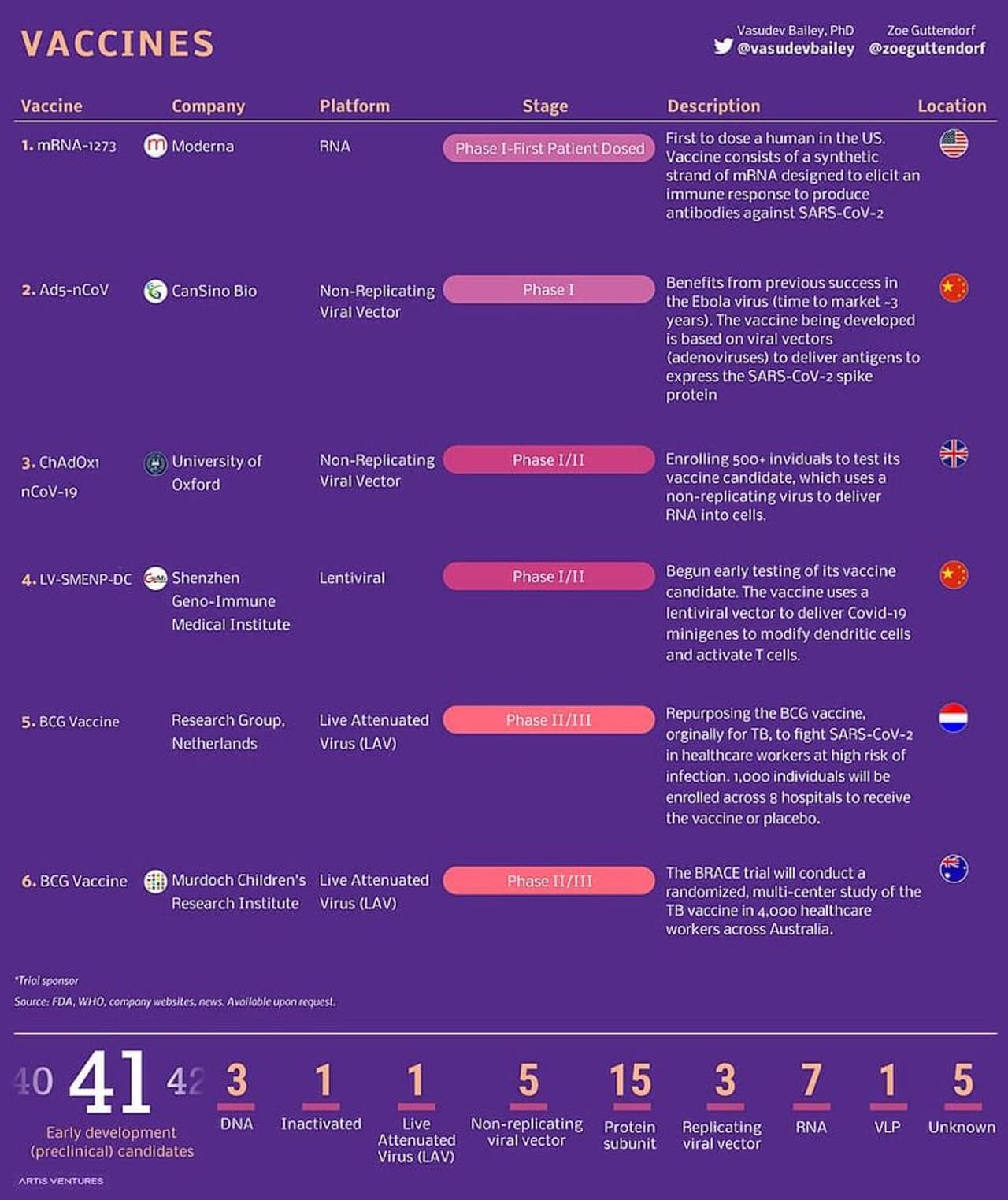 வாஷிங்டனில் நடைபெற்று வரும் சோதனைகள் அனைத்தும் 2020 இலையுதிர் காலத்திற்குள் தன் ஆரம்ப கட்ட சோதனைகளை நிறைவு செய்யும் என எதிர்பார்க்கப்படுகிறது மேலும் 15 வகையான தடுப்பூசி மற்றும் டெஸ்ட் டியூப் சோதனையில் இருப்பதாகவும் உலக சுகாதார நிறுவனம் தெரிவித்துள்ளது அது எந்தெந்த வகையான தடுப்பூசிகள் என்பதன் விவரம் மேலே உள்ளது.