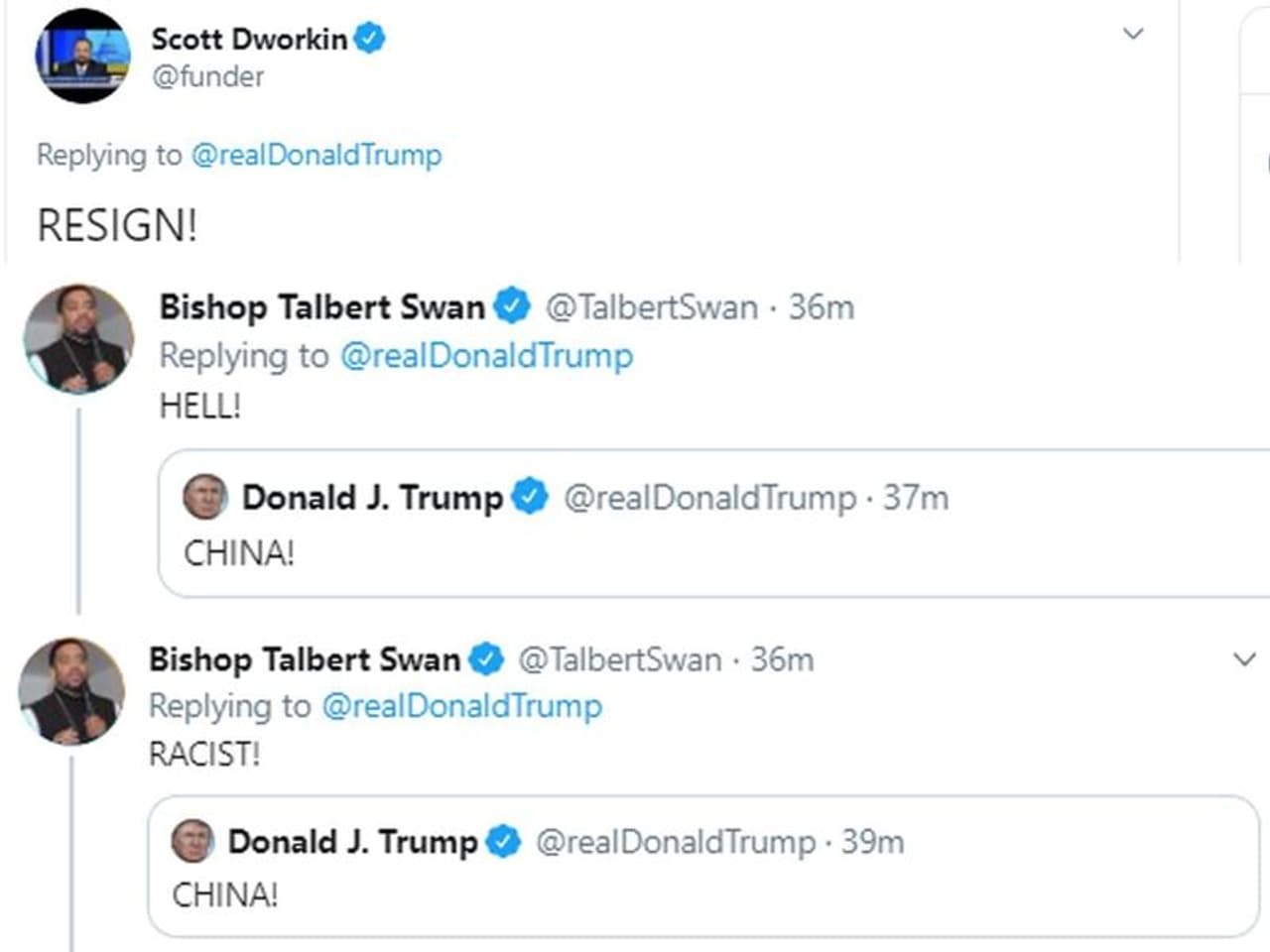 எப்போதும் ட்விட்டரில் மிக ஆக்டிவாக இருக்கும் அதிபர் டிரம்ப், நேற்று தனது ட்விட்டர் பக்கத்தில் "சீனா" என ஒற்றை வார்த்தையை மட்டும் பதிவு செய்தார், அதனுடன் வேறு எந்த வார்த்தையும் அவர் பதியவில்லை, இதன் மூலம் பலர் சீனா குறித்து தங்களது அபிப்ராயத்தை டுவிட்டரில் வெளிபடுத்திவருகின்றனர். அவர் அவ்வாறு பதிவிட்ட ஒரு சில மணி நேரங்களில் ஒரு லட்சத்து 12 ஆயிரம் லைக்குகள், 42,500 கமெண்ட்டுகள், 5.6 ஆயிரம் பதில் ட்வீட்டுகள் வந்திருந்தன. ஏராளமானோர் "சீனா" என்ற வார்த்தைக்கு மிகக்கடுமையாக பதில் அளித்திருந்தனர், பெரும்பாலானோர் பதில்கள் ஒற்றை வார்த்தையில் இருந்தது. அதில் பலர் Resign என்று பதிவிட்டிருந்தனர், சிலர் இனவாதி என்று குறிப்பிட்டிருந்தனர். கருப்பினத்தைச் சேர்ந்த ஒருவர் போலீஸ் காவலில் அடித்துக் கொள்ளப்பட்டதை குறிக்கும் வகையில் ட்ரப்பை இவ்வாறு தாக்கியிருந்ததாக தெரிகிறது. அமெரிக்க அதிபர் டிரம்ப் பின் இந்த டுவிட்டர் விளையாட்டால் சீனா மிகப் பெரும் கோபத்திற்கு ஆளாகி உள்ளது. அதே நேரத்தில் சீனாவை வார்த்தைகளால் துன்புறுத்துவதாக எண்ணி ட்ரம்ப் பதிவிட்ட டுவிட்டால் பவர் அவரையே கடுமையாக விமர்சித்து பதிவிட்டது, சும்மா இருந்த சங்கை ஊதி கெடுத்த கதையாகி உள்ளது.