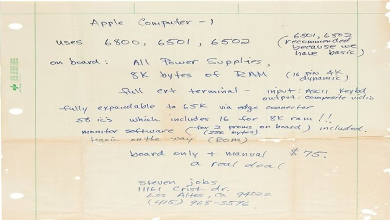 ஸ்டீவ் ஜாப்ஸ் எழுதிய அந்த விளம்பரக் கடிதம் கருப்பு மையால், 8.5 x 11 பைண்டர் தாளில் நேர்த்தியாக எழுதப்பட்டுள்ளது. Apple-1 கணினிக்கான தோராயமான வரைவு விவரக்குறிப்பும் அதில் இடம்பெற்றுள்ளது. தொழில்நுட்ப வரலாற்றின் குறிப்பிடத்தக்க பகுதியாகும். இது ஆப்பிளின் ஆரம்ப நாட்களையும், தொழில்நுட்ப புரட்சியைத் தூண்டிய ஸ்டீவ் ஜாப்ஸின் தொலைநோக்குப் பார்வையை பற்றிய நுண்ணறிவையும் எடுத்துக்காட்டும் வகையில் உள்ளது.