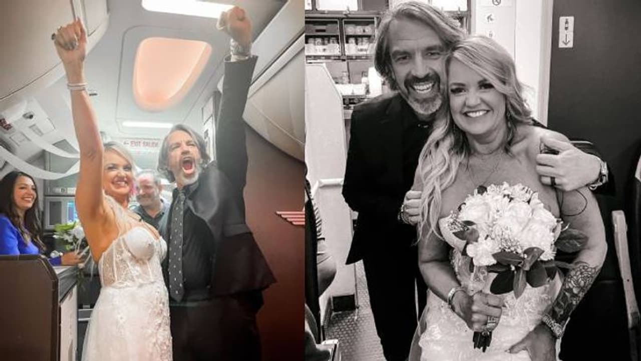 ஒக்லஹோமா நகரை சேர்ந்த பேம் மற்றும் பேட்டர்சன் திருமணம் செய்து கொள்ள முடிவு செய்தனர். அதன்படி இருவருக்கும் லாஸ் வேகாஸ் தேவாலயம் ஒன்றில் திருணம் நடத்துவதற்கான ஏற்பாடுகள் செய்யப்பட்டன. இந்த நிலையில், இந்த தம்பதிக்கு நடுவானில் திருமணம் நடைபெற்ற சம்பவம் பலரையும் அதிர்ச்சியில் ஆழ்த்தி இருக்கிறது.
