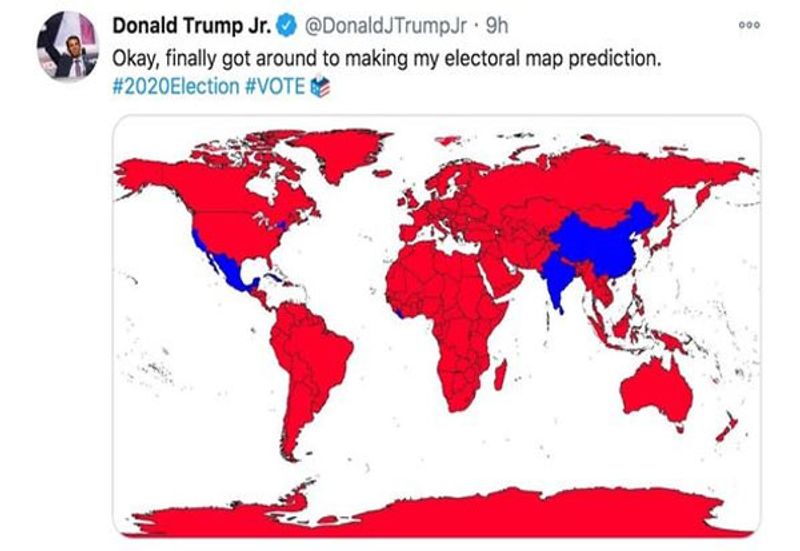 அமெரிக்காவில் அதிபர் தேர்தல் முடிவுகள் வெளியாகி கொண்டிருக்கின்றன. வெற்றி முடிவுகளை தேர்தல் வரைபடம் மூலம் விளக்குவார்கள். அமெரிக்க வரைபடத்தில் குடியரசு கட்சி வென்ற மாநிலங்களை சிகப்பு நிறத்திலும், ஜனநாயக கட்சி வென்ற மாநிலங்களை நீல நிறத்திலும் வண்ணம் தீட்டி பிரித்து காண்பிப்பார்கள். இந்த நிலையில் டிரம்பின் மகன் ஜூனியர் டிரம்ப் 'தேர்தல் வரைபடம் பற்றிய என்னுடைய கணிப்பு' என்று கூறி உலக வரைபடத்தை வெளியிட்டுள்ளார். அதில் இந்தியா, சீனா, மெக்சிகோ ஆகியவற்றை நீல நிறத்திலும், பிற நாடுகளை சிகப்பு நிறத்திலும் காட்டியுள்ளார். அதிலும் இந்திய வரைபடத்தில் காஷ்மீர் மற்றும் வடகிழக்கு மாநிலங்கள் சிகப்பு நிறத்தில் உள்ளன.