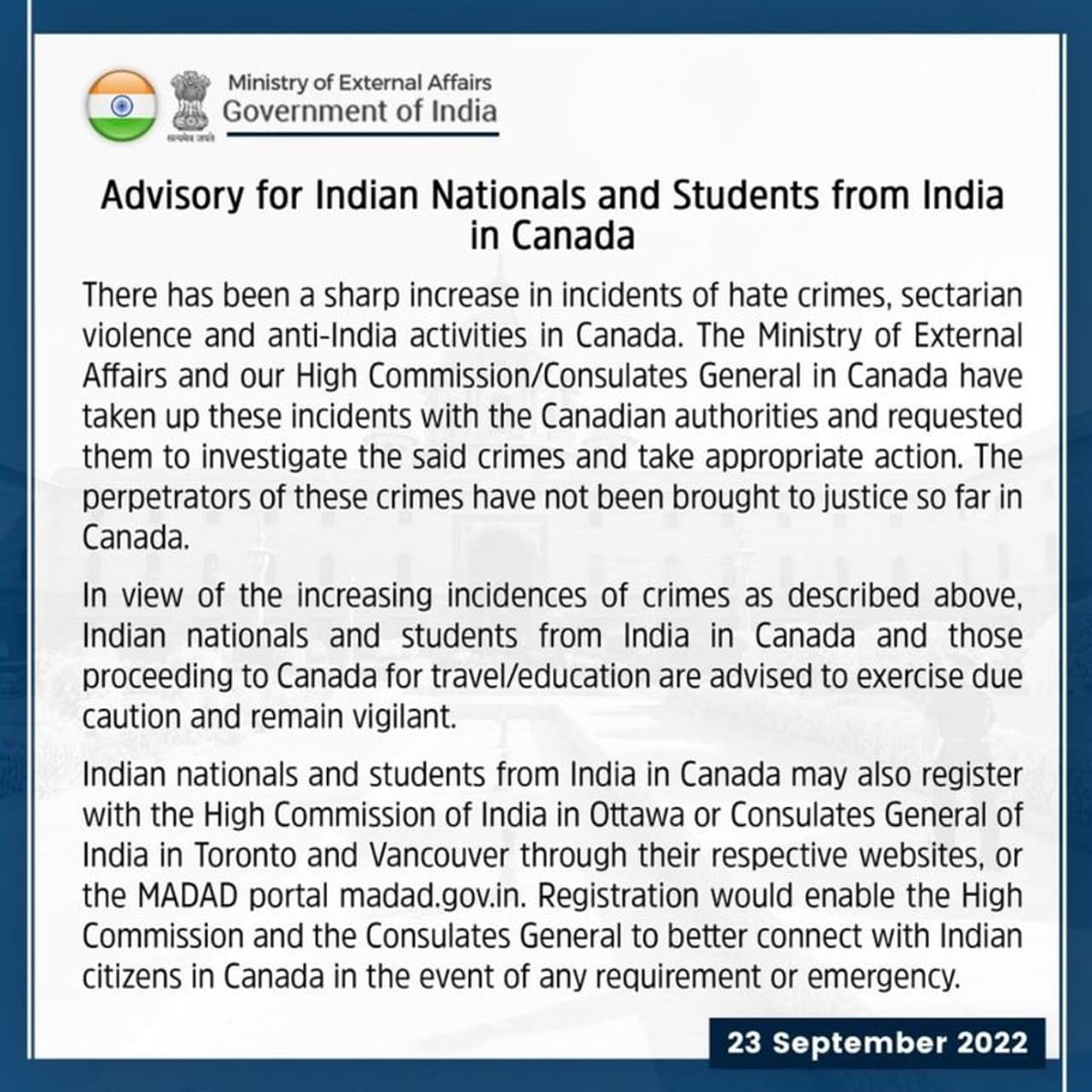 மத்திய அரசு வெளியிட்டுள்ள அறிவிப்பில், ‘வெறுப்புத் தாக்குதல்கள், பிரிவினைவாத வன்முறைகள், இந்தியாவுக்கு எதிரான நடவடிக்கைகள் கனடாவில் அண்மைக்காலமாக அதிகரித்துள்ளது. தூதரகம் வாயிலாக கனடா நாட்டிற்கு இந்தக் குற்றங்கள் மீது விசாரணை நடத்தி உரிய நடவடிக்கை எடுக்குமாறு தெரிவிக்கப்பட்டுள்ளது.
