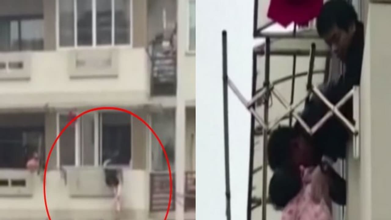 சீனாவின் மக்கள் கூட்டம் நிறைந்த 'சே ஜியான்ங்' என்ற பகுதியில் இந்த சம்பவம் நடந்து இருக்கிறது. அங்கு இருந்த கட்டிடம் ஒன்றில் மூன்றாவது மாடியில் குழந்தை ஒன்று தொங்கிக் கொண்டு இருந்துள்ளது. ஜன்னலுக்கு வெளியே வந்து சிறிய சுவற்றில் ஒட்டிக் கொண்டு இருந்த அந்த குழந்தையை அருகில் இருக்கும் குடியிருப்பில் குழந்த தொங்கி கொண்டு இருந்ததை பார்த்த இளைஞர் ஒருவர். பக்கத்து வீட்டு பால்கனி வழியாக சென்று அந்த குழந்தையை தூக்கி இருக்கிறார். இதனால் பெரிய அசம்பாவிதம் தடுக்கப்பட்டது.
