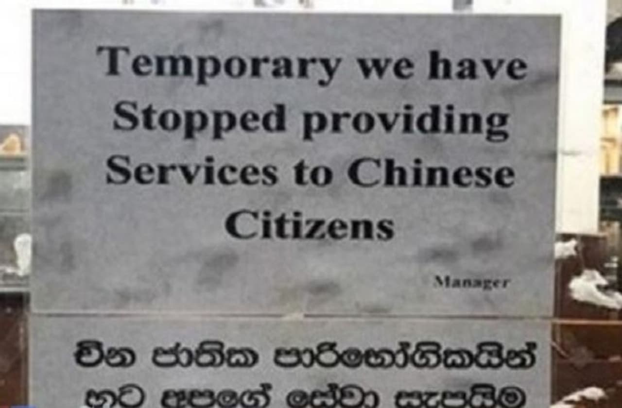 கொரோனா வைரஸ் எதிரொலியாக தற்காலிகமாக சீனர்களுக்கு தங்களது உணவகத்தில் அனுமதி இல்லை என இலங்கையைச் சேர்ந்த உணவு விடுதியில் அறிவிப்பு பலகை வைக்கப்பட்டுள்ளது, 2020 ஆண்டின் தொடக்கமே சீனாவுக்கு போதாத காலமாக அமைந்துவிட்டது . கொரோனா வைரஸ் என்ற கொடிய வைரஸ் அந்நாட்டின் மிக வேகமாக பரவி மக்களைக் கொன்று குவித்து வருகிறது . நோயை கட்டுப்படுத்த அரசு முழுவீச்சில் போராடி வந்தாலும் நோய் மிக வேகமாகப் பரவி வருகிறது.