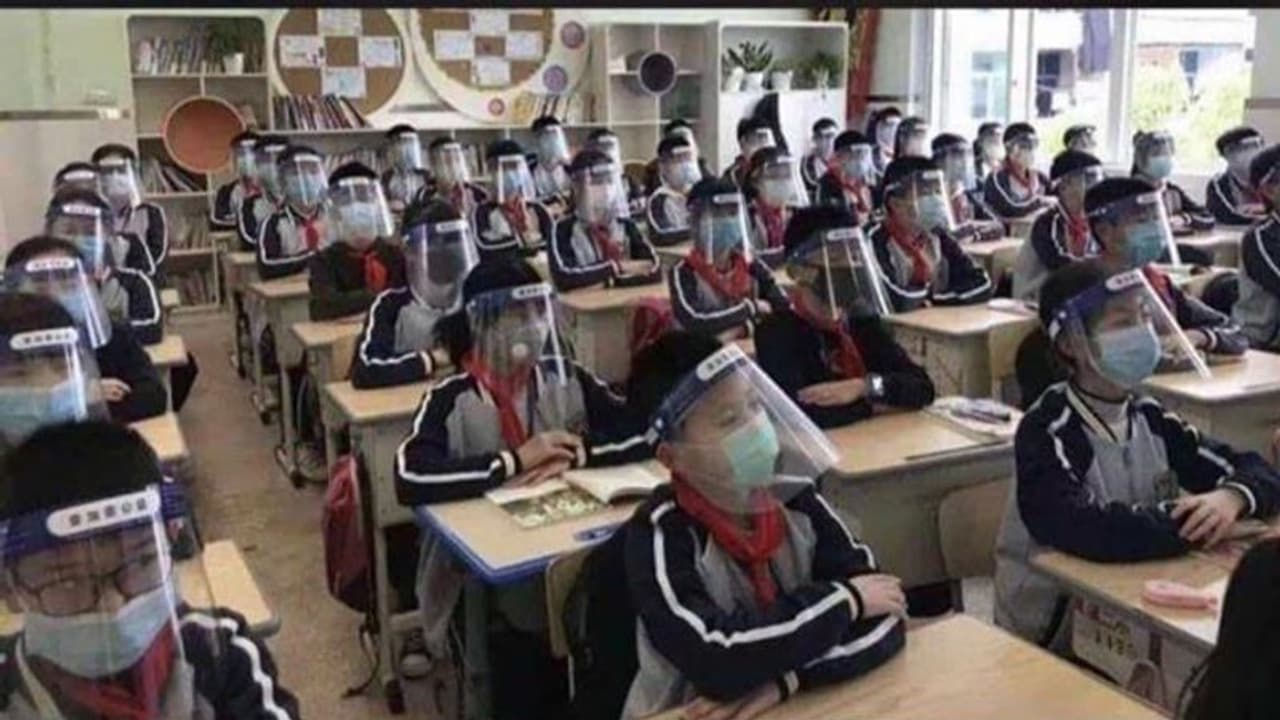 பள்ளி வரும் குழந்தைகள் முகக்கவசத்தோடு சேர்ந்து முழு முகத்தையும் பாதுகாக்கும் விதமாக பிளாஸ்டிக் மாஸ்க்கையும் அணிந்து பாடங்களை கவனித்து வருகின்றனர். சீனக்குழந்தைகளின் இந்த புதுவித சீருடை புகைப்படங்கள் சோசியல் மீடியாவில் வைரலாகி வருகிறது. கண், மூக்கு, வாய் போன்ற இடங்களை கையால் தொடுவது ஆபத்தானது என்பதால் இந்த புதுவித மாஸ்க்கை அனைத்து குழந்தைகளும் அணிந்துள்ளனர். அதேபோல் பள்ளி குழந்தைகளை தேர்வுக்கு தயார் செய்வதை விட சமூக இடைவெளியின் அத்தியாவசியம் குறித்தே தற்போது வகுப்புகள் எடுக்கப்படுகின்றன.