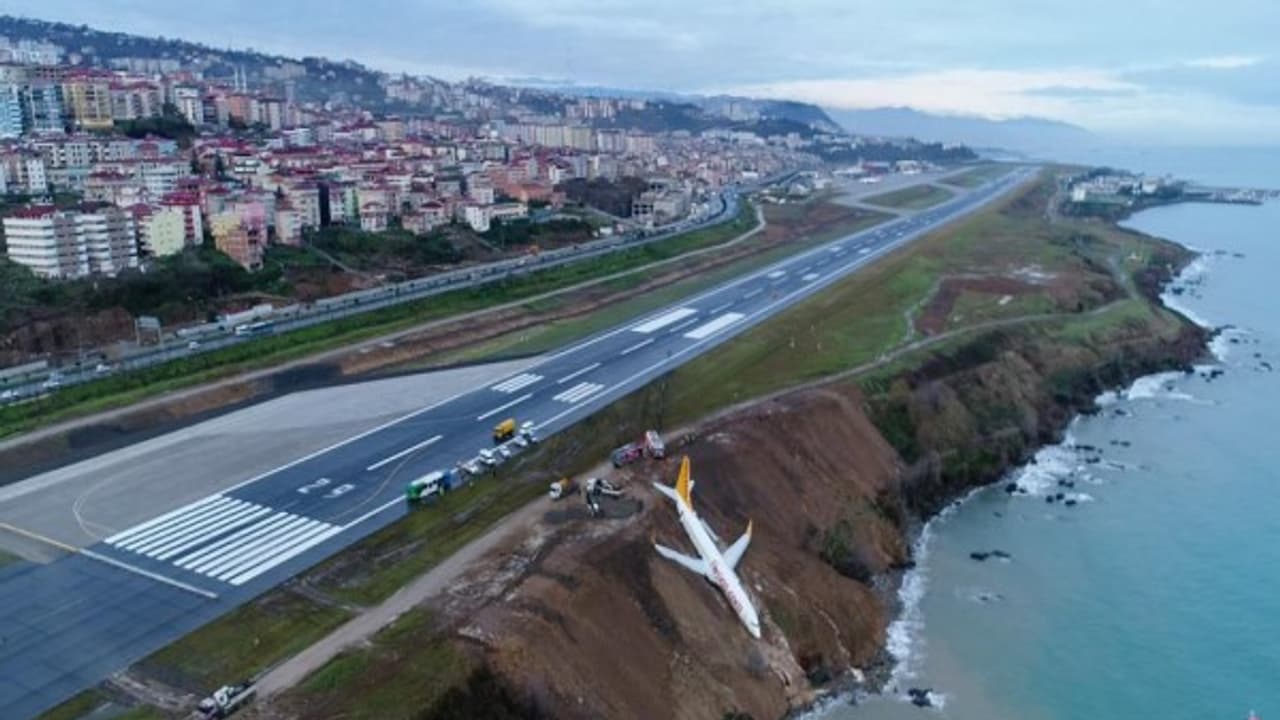 துருக்கியில் உள்ள டிராப்சன் விமான நிலையத்தில் தரையிறங்கிய விமானம் ஓடுபாதையில் இருந்து விலகி பள்ளத்தில் சறுக்கி சென்று கடலில் பாய்ந்தது விமானம். பயணித்த அனைவரும் நல்ல வேளையாக உயிர் பிழைத்தனர்.