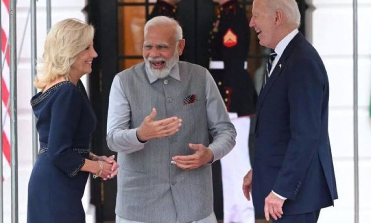 அரசு முறை பயணமாக அமெரிக்கா சென்றுள்ள பிரதமர் மோடி, தனது நியூயார்க் பயணத்தை முடித்துக் கொண்டு வாஷிங்டன் சென்றுள்ளார். இதையடுத்து, வெள்ளை மாளிகைக்கு சிறப்பு அழைப்பாளராக சென்ற பிரதமர் மோடிக்கு சிறப்பான வரவேற்பு அளித்து, அமெரிக்க முதல் பெண்மணி ஜில் பைடன் மற்றும் அதிபர் ஜோ பைடன் வரவேற்றனர்.