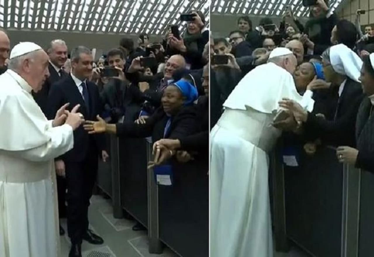 போப் பிரான்சிஸ் சில நாட்களுக்கு முன் புத்தாண்டையொட்டி , வாடிகன் சிட்டியில் பார்வையாளர்களை நோக்கி கையசைத்தபடி வந்த போது, பெண் ஒருவர், போப் கையைப் பிடித்து இழுத்தார்.
