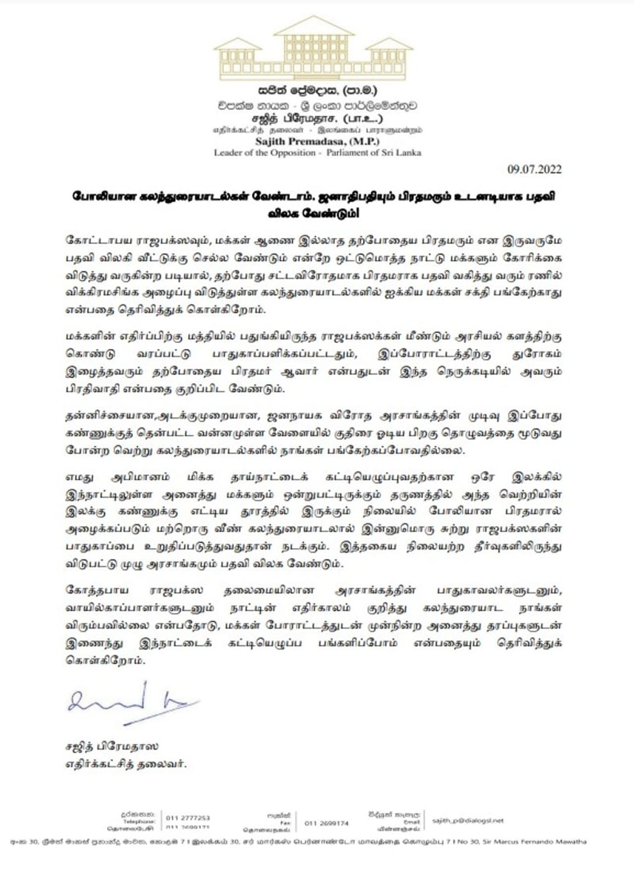 இந்நிலையில் இலங்கையின் எதிர்க்கட்சித் தலைவரான சஜித் பிரமதேஸா, வெளியிட்ட அறிக்கையில், “ இலங்கை பிரதமர் பதவியிலிருந்து ரணில் விக்ரமசிங்கேவும், அதிபர் பதவியிலிருந்து கோத்தபய ராஜபக்சவும் பதவி விலக வேண்டும். ரணில் ஏற்பாடு செய்திருக்கும் ஆலோசனைக்கூட்டத்தில் ஐக்கிய மக்கள் சக்தி கட்சி பங்கேற்காது.