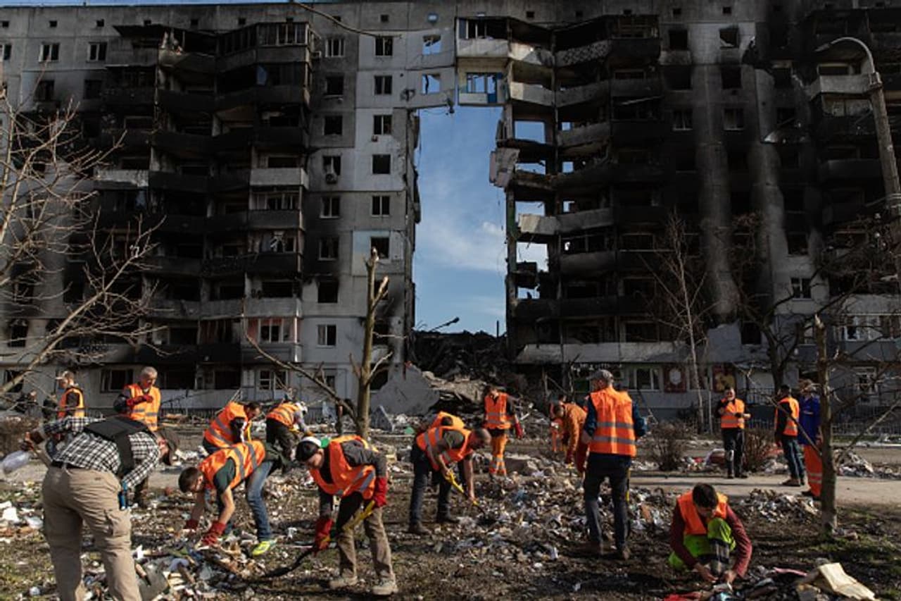 சிலர் தூக்கிலிட்டப்பதற்கான அடையாளங்கள் உள்ளதாகவும் அவர் குறிப்பிட்டுள்ளனர். தெருக்களில் கைவிடப்பட்ட நிலையிலும், தற்காலிகமாக புதைக்கப்பட்ட நிலையிலும் உடல்கள் கிடந்தாகவும், ஒவ்வொரு நாளும் அதிகமான உடல்கள், இடிபாடுகளுக்கு அடியில் இருந்து மீட்கப்பட்டு வருவதாகவும் கீவ் பிராந்திய பகுதி காவல்துறை தலைவர் ஆண்ட்ரி நெபிடோவ் தெரிவித்துள்ளார். தற்போது ரஷியாவிற்கு எதிராக உக்ரைன் நடத்திய தாக்குதலில் ரஷியாவின் மோஸ்க்வா எனும் போர்க் கப்பல் தீப்பிடித்து மூழ்கியதாக தெரிவிக்கப்பட்டுள்ளது.