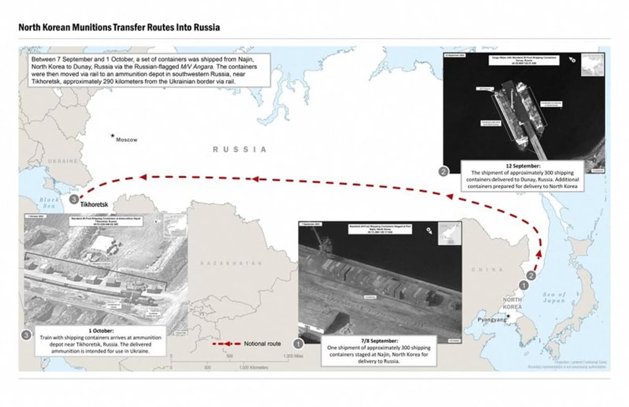 அமெரிக்க தேசிய பாதுகாப்பு கவுன்சில் செய்தித் தொடர்பாளர் ஜான் கிர்பி கூறுகையில், சமீபத்திய வாரங்களில் வட கொரியா 1,000 க்கும் மேற்பட்ட ராணுவ தளவாடங்கள் மற்றும் வெடிமருந்துகளை ரஷ்யாவிற்கு வழங்கியதாக அமெரிக்காவுக்குத் தகவல் கிடைத்துள்ளது.
